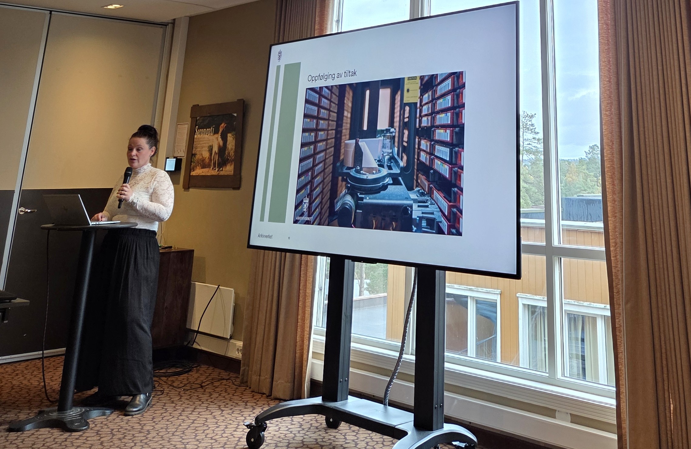Først på programmet sto konstituert seksjonsleder for tilsyn i Arkivverket, Ingrid Holløken Lyngmo. Hun fortalte om Arkivverkets tilsynsarbeid og presenterte funn og refleksjoner etter gjennomførte tilsyn. Dette ga nyttig kunnskap om hva som fungerer godt, og ikke minst hvor det fortsatt er rom for forbedring.